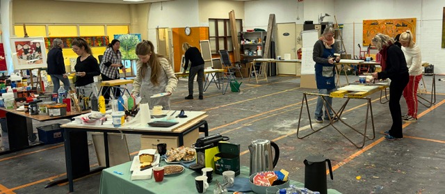 Schilder, lach en geniet — de koffie, de verf, doeken en materialen staan klaar.